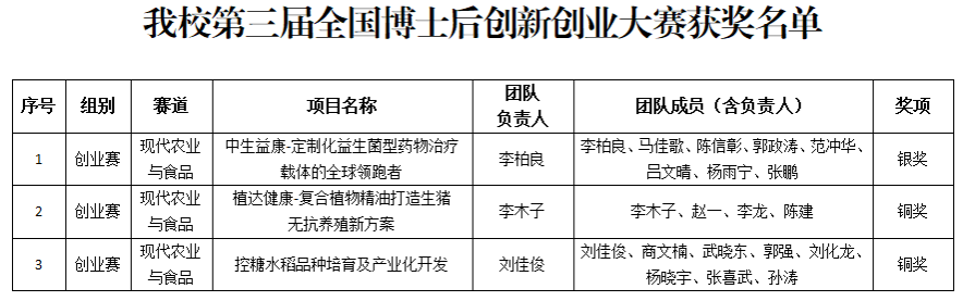 10月26日至28日,第三届全国博士后创新创业大赛在福建省泉州市举行。本届大赛以“博创引领四十载 智汇赋能向未来”为主题,共吸引全国46支参赛队伍,共计1700余个项目入围总决赛。我院李柏良、马佳歌带领的“中生益康-定制化益生菌型药物治疗载体的全球领跑者”项目获创业赛组,现代农业与食品赛道银奖。