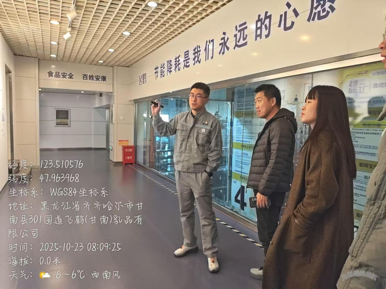 在工厂参观环节,杜鹏一行参观了飞鹤生产线与实验室。公司经理李楠、生产事业部人事经理张吉坤与我校专家就生产工艺与品控细节进行了深入探讨交流。