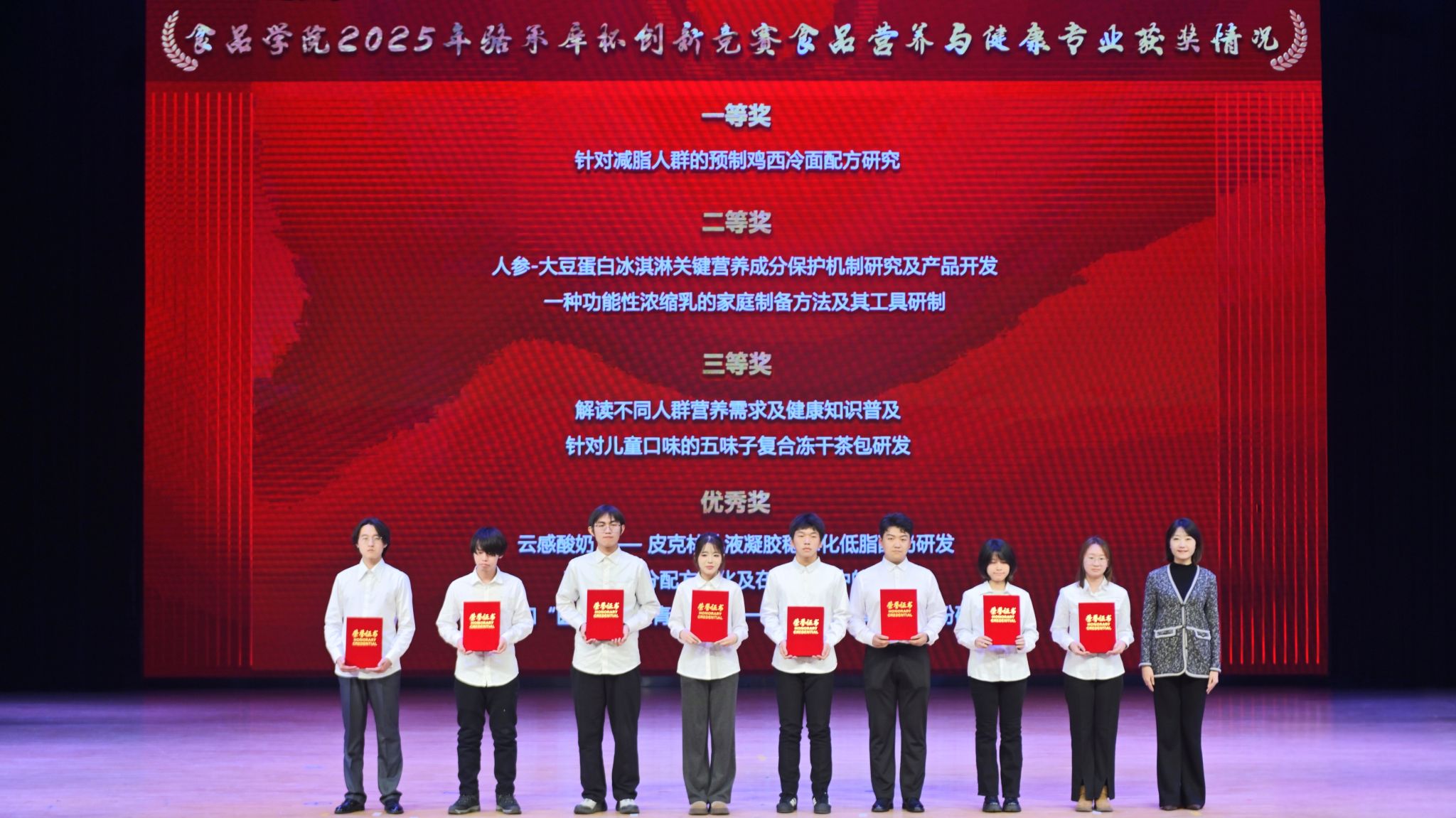 大会在庄严的国歌声中拉开序幕。“骆承庠杯”创新竞赛由2021年设立的“骆承庠教育基金”资助创办,以“传承学术薪火、激发创新活力”为核心使命。本届赛事自5月启动,历时5个月完成全流程角逐,吸引全院5个专业50支团队、百余名学生参赛,作品涵盖功能食品研发、科普视频制作等多个领域。最终评选出一、二、三等奖及优秀奖共50项,徐宁等5位教师获评“优秀指导教师”,夏宁等5位老师获评“优秀组织奖”。活动现场当晚,所有获奖队伍进行集中展示宣传,全方位呈现参赛作品的创新价值与实践成果。