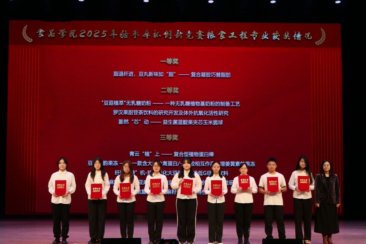 表彰环节中,与会领导依次为获奖团队及优秀指导教师颁奖。获奖学生代表上台分享科创实践感悟,传递食品学子“敢闯敢试、追求卓越”的精神风貌。