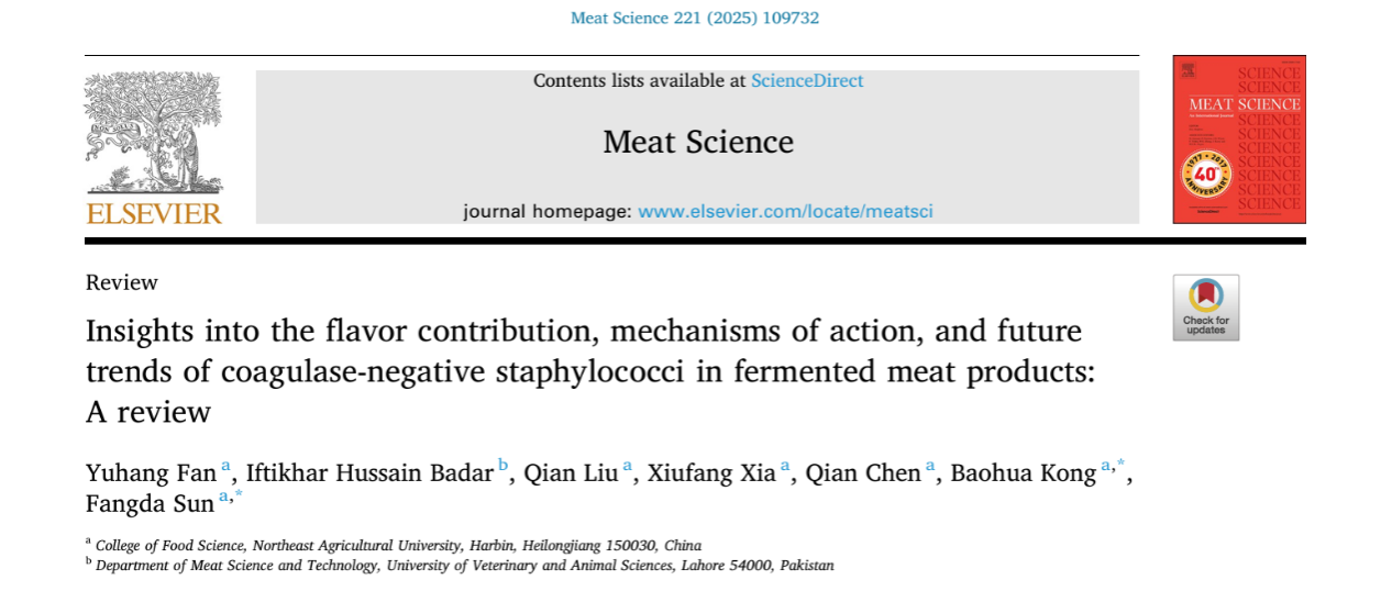 肉品在发酵过程中的微生物多样性是其形成独特风味的主要因素,其中凝固酶阴性葡萄球菌是发酵肉制品的品质与风味塑造具有重要影响。2025年3月,博士研究生范宇航作为第一作者、孔保华教授与孙方达副教授作为共同通讯作者在《Meat Science》(论文链接:https://doi.org/10.1016/j.meatsci.2024.109732)上发表了题为“Insights into the flavor contribution, mechanisms of action, and future trends of coagulase-negative staphylococci in fermented meat products: A review”的综述论文。该论文系统综述了凝固酶阴性葡萄球菌在肉制品的作用机制、应用现状及未来发展趋势,为发酵肉制品品质提升与产业化应用提供了科学参考。本研究得到了国家自然科学基金的资助。