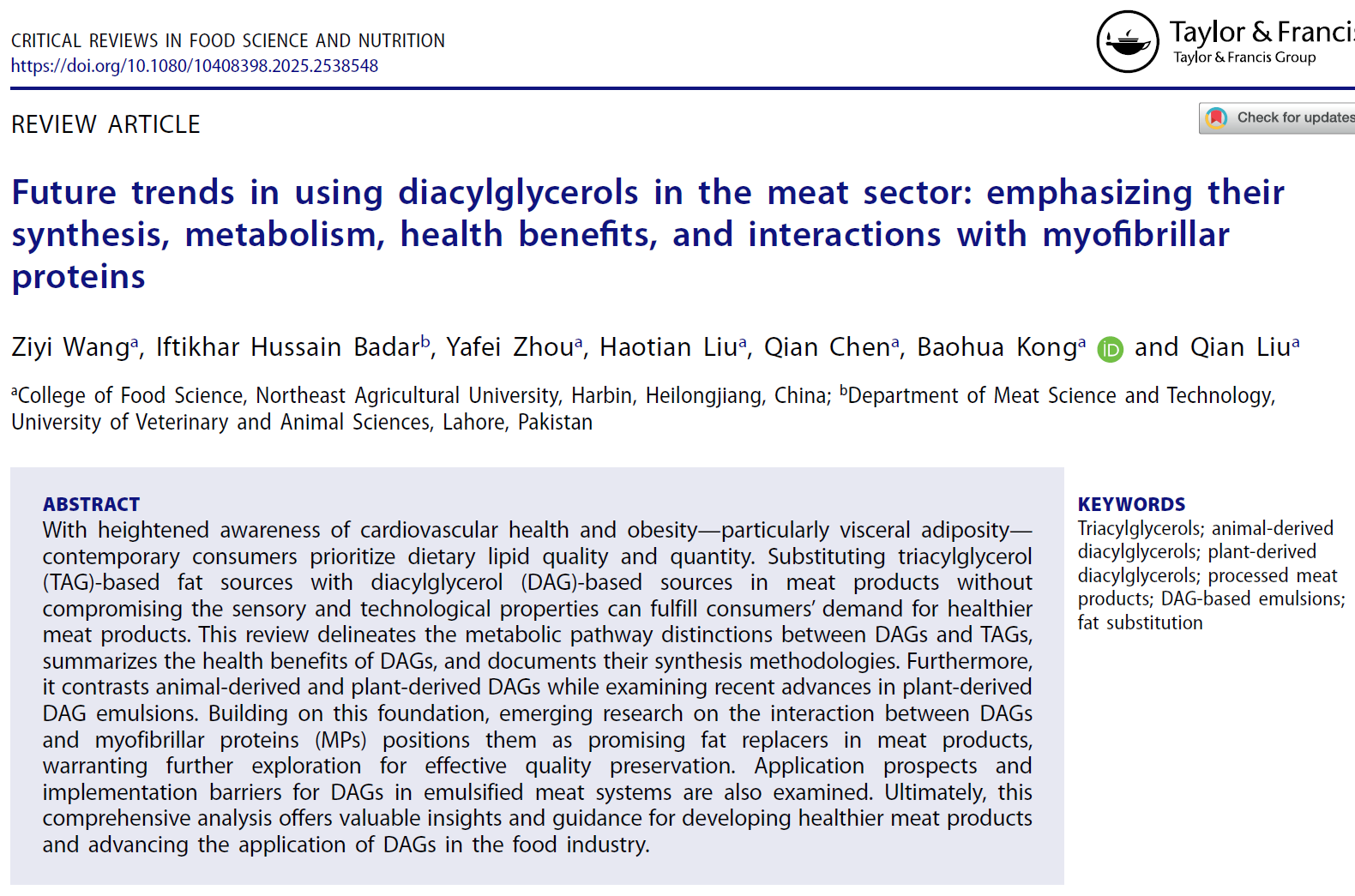 我国成年居民的超重肥胖率持续处于较高水平,儿童青少年超重肥胖问题也日益突出,这与日常饮食中甘油三酯过量摄入密切相关。2025年7月,博士研究生王梓溢作为第一作者、孔保华教授与刘骞教授作为共同通讯作者在《Critical Reviews in Food Science and Nutrition》(论文链接:https://doi.org/10.1080/10408398.2025.2538548)上发表了题为“Future trends in using diacylglycerols in the meat sector: emphasizing their synthesis, metabolism, health benefits, and interactions with myofibrillar proteins”的综述论文。该论文系统综述了甘油二酯(DAG)的代谢途径、健康益处、合成方法及其乳化特性,并进一步阐述了DAG与肌原纤维蛋白相互作用机制,为DAG在肉制品中作为脂肪替代物提供了重要理论依据。本研究得到了“十四五”国家重点研发计划项目的资助。