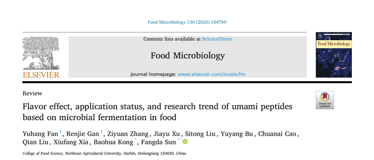 鲜味肽是蛋白质降解形成的关键风味成分,能有效增强食品鲜味并提升产品品质。微生物发酵法因具备成本效益高、易于规模化生产等优势,已成为鲜味肽生产的重要途径。2025年3月,博士研究生范宇航与硕士研究生干仁杰作为共同第一作者、孔保华教授与孙方达副教授作为共同通讯作者在《Food Microbiology》(论文链接:https://doi.org/10.1016/j.fm.2025.104769)上发表了题为“Flavor effect, application status, and research trend of umami peptides based on microbial fermentation in food”的综述论文。该论文系统综述了鲜味肽的味觉特性、影响因素以及制备方法,并总结了其在各类食品中的应用现状,为推动鲜味肽的微生物发酵生产提供了科学参考。本研究得到了国家自然科学基金的资助。