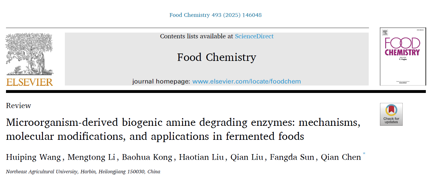 生物胺是发酵肉制品中常见的危害因子,基于微生物酶作用的生物胺降解技术因其安全性与高效性备受关注。尽管当前对生物胺降解酶的特性与修饰已有广泛的研究,但其在真实的发酵食品体系中的应用仍然面临诸多挑战。2025年8月,博士研究生王慧平作为第一作者、陈倩教授作为通讯作者在《Food Chemistry》(论文链接:https://doi.org/10.1016/j.foodchem.2025.146048)上发表了题为“Microorganism-derived biogenic amine degrading enzymes: mechanisms, molecular modifications, and applications in fermented foods”的综述论文。该论文系统综述了生物胺降解酶的分类、催化机制及分子修饰策略,并进一步探讨了这类酶在实际发酵食品体系中的应用现状与面临的局限性,为推动其在发酵食品工业中的实际应用提供了理论参考。本研究得到了国家自然科学基金和黑龙江省自然科学基金的资助。
