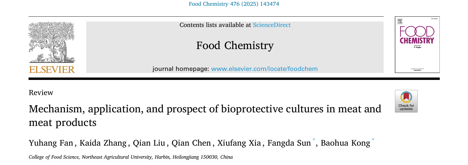 面对肉类及肉类制品在抑菌保鲜方面的挑战,生物保护菌因其符合清洁标签需求、具备成本效益及长期可持续等优势,已成为行业关注焦点,其中乳酸菌应用尤为广泛。2025年2月,博士研究生范宇航作为第一作者、孔保华教授与孙方达副教授作为共同通讯作者在《Food Chemistry》(论文链接:https://doi.org/10.1016/j.foodchem.2025.143474)上发表了题为“Mechanism, application, and prospect of bioprotective cultures in meat and meat products”的综述论文。该论文系统综述了生物保护菌在肉类及肉制品中的作用机制与应用效果,并进一步总结了其在各类肉制品中的应用现状,同时对该领域的研究前景和发展趋势进行了展望。本研究得到了国家自然科学基金的资助。