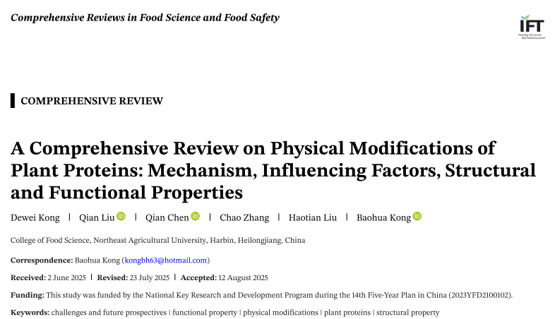 随着植物基食品需求的快速增长以及清洁标签理念的深入普及,如何利用非热物理修饰技术提升植物蛋白的加工适应性和功能品质,已成为食品科学领域的研究热点。2025年8月,博士研究生孔德薇作为第一作者、孔保华教授作为通讯作者,在《Comprehensive Reviews in Food Science & Food Safety》(论文链接:https://doi.org/10.1111/1541-4337.70273)上发表了题为“A Comprehensive Review on Physical Modifications of Plant Proteins: Mechanism, Influencing Factors, Structural and Functional Properties”的综述论文。该论文系统阐述了超声、高压、冷等离子体及脉冲电场等非热物理修饰技术对植物蛋白的作用机制、影响因素及其对结构与功能性质的调控规律,为植物蛋白的结构设计和食品加工应用提供了新的思路与理论依据。本研究得到了“十四五”国家重点研发计划项目的资助。