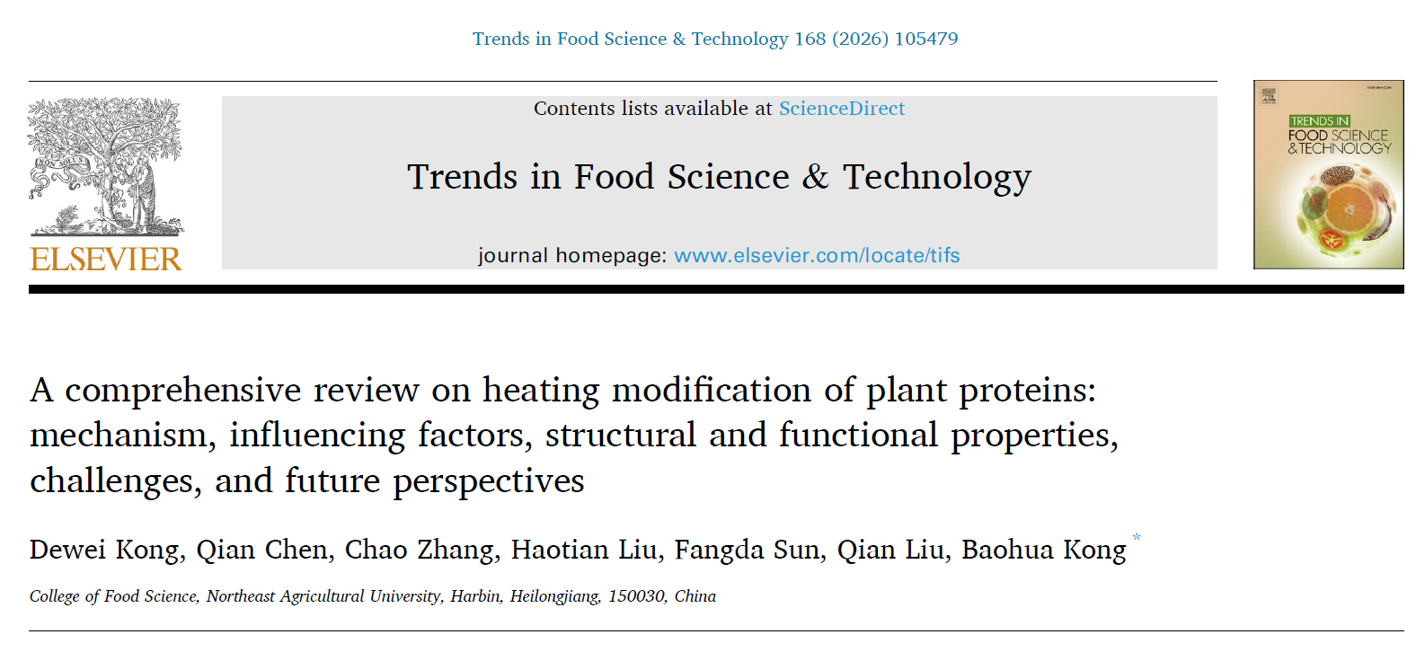 随着植物蛋白市场需求的持续增长及其在加工应用中面临的功能性挑战,加热物理修饰技术日益成为提升植物蛋白品质的重要途径。2025年12月,博士研究生孔德薇作为第一作者、孔保华教授作为通讯作者,在《Trends in Food Science & Technology》(论文链接:https://doi.org/10.1016/j.tifs.2025.105479)上发表了题为“A comprehensive review on heating modification of plant proteins: mechanism, influencing factors, structural and functional properties, challenges, and future perspectives”的综述论文,该论文系统综述了传统加热、挤压加热以及电/电磁场加热技术(包括微波、射频、欧姆加热)对植物蛋白的作用机制、影响因素,及其对植物蛋白结构与功能特性的调控效果,为植物蛋白的结构设计与食品加工应用提供了新的思路与理论依据。本研究得到“十四五”国家重点研发计划项目的资助。